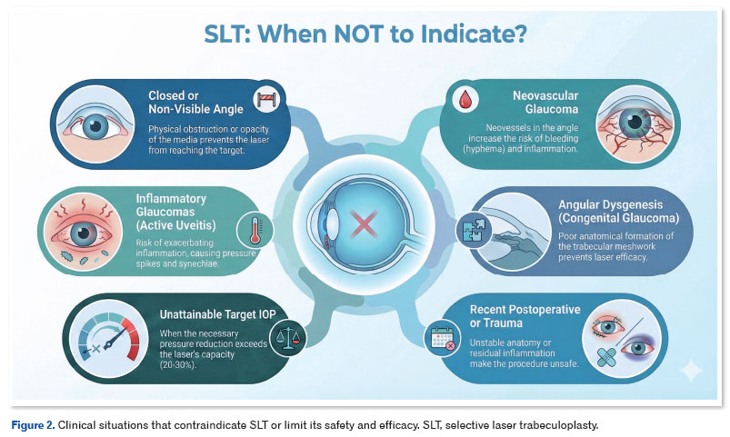 With regard to contraindications, it is essential to understand that the efficacy of SLT depends directly on its ability to remodel and increase the permeability of the trabecular meshwork. Therefore, in clinical situations where resistance to aqueous humor outflow is caused by pre-trabecular alterations (such as a closed iridocorneal angle, inflammatory or neovascular membranes covering the angle) or by post-trabecular alterations (such as increased episcleral venous pressure), the laser tends to have no effect. In addition to this pathophysiological limitation, contraindications are based on the inability to visualize the target structures or the presence of conditions that may be aggravated by the inflammatory mechanism of the procedure (Figure 2).