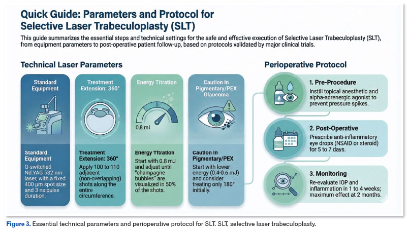 Finally, we do not recommend SLT treatment when the tension reduction required to reach the target IOP exceeds the laser's statistical hypotensive capacity. Knowing that SLT provides, on average, a 20%–30% reduction in baseline pressure (equivalent to the effect of a prostaglandin)2,18, patients with very high IOP who need drastic reductions (for example, greater than 40% or 50%) to halt the progression of the disease are not ideal candidates for the laser. In these cases of severe dysregulation, insisting on SLT can delay surgery or more effective treatments, exposing the optic nerve to unnecessary risk.
