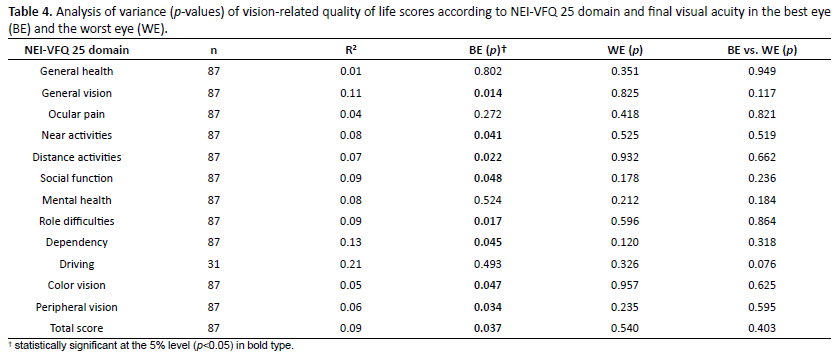 METHODS: This observational clinical study included 87 patients clinically diagnosed with nAMD between September 2013 and November 2016 at three ophthalmology referral centers in São Paulo and Paraná (Brazil). At the end of the treatment, a validated Portuguese-language version of the NEI-VFQ 25 was self-administered, covering 12 domains. The findings were correlated with age, gender, disease laterality, and best-corrected visual acuity (VA) of the best eye and the worst eye.