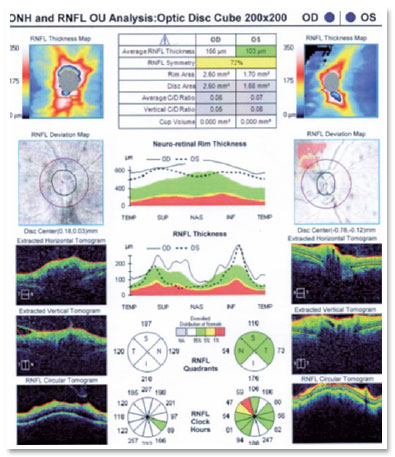 Figura 3. OCT de nervo óptico demonstrando edema do nervo em OD e leve diminuição da camada de fibras nervosas nasal superior do OE e com discreto aumento inferior. (OCT: Carl Zeiss Cirrus 5000).