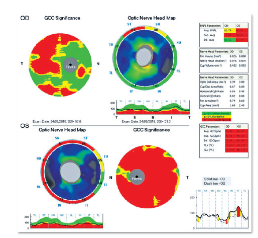 Optical coherence tomography (Figure 6, 7) showed superior temporal thinning of peripapilary nerve fiber layer in OR and diffuse thinning in OS, except for the lateral temporal region. The macular ganglion cell layer report (Figure 8) showed perifoveal thinning in OU.