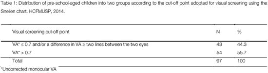 Table 1shows the distribution of the pre-school-aged children into two groups according to the cut-off point adopted for visual screening.