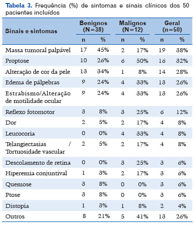 Os sinais e sintomas mais encontrados foram massa tumoral (38%), proptose (32%) e alteração da coloração da pele (28%), entre as quais destacam-se hiperemia e lesões violáceas (Tabela 3).