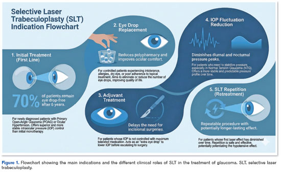 The clinical versatility of SLT allows it to be strategically integrated into different clinical situations. It is currently indicated in different practical scenarios with the aim of personalizing treatment to the specific needs of each patient, as discussed below (Figure 1):
