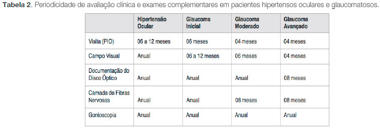 A periodicidade para a realização dos exames perimétricos deve ser modulada, baseando-se primordialmente na expectativa da progressão da doença (Tabela 2). Esta expectativa depende, por sua vez: