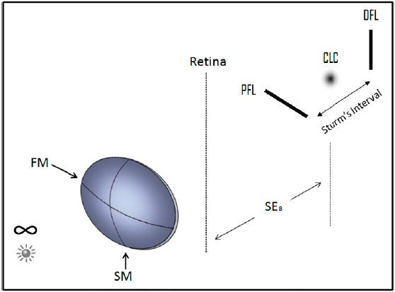 Para cada ponto objeto, a superfície refrativa tórica gera duas linhas imagens perpendiculares entre si, centradas na linha sagital que passa pelo seu centro óptico. Se o ponto objeto estiver no infinito, cada linha imagem se torna uma linha focal1. A formação de uma linha focal proximal e de uma distal para cada ponto objeto configura uma aberração óptica chamada de aberração astigmática ou astigmatismo. É uma aberração porque se esperaria um único ponto focal para cada ponto objeto. O intervalo entre as duas linhas focais é conhecido como Intervalo de Sturm. Sua extensão, em dioptrias, quantifica o astigmatismo (Figura 1).